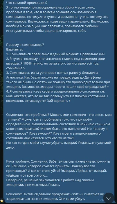 Разгребаю постепенно свои сохранёнки и удаляю ненужное. Перебрасываю сюда пост, который писал 5 лет назад в депрессии. Как я говорил уже, с детства, в силу психических расстройств видимо, пытался разобраться как работает эта Вселенная, в чём смысл жизни и т.д. Но интереснее всего мне было как работает наш мозг, наша психика, мышление и т.д. Недавно узнал, что это называется "интроспекция".