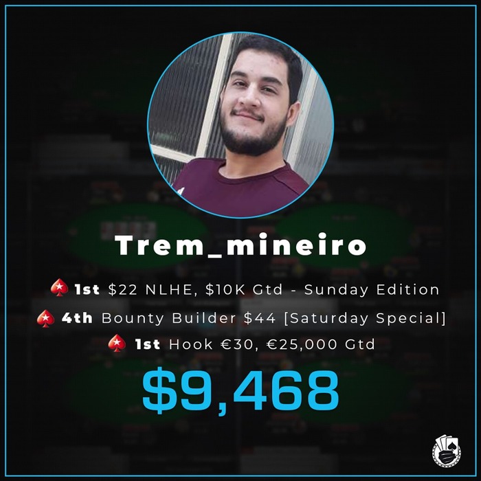 Поздравляем Trem_mineiro с заносами двух турниров: Hook €30, €25,000 Gtd и $22 NLHE, $10K Gtd - Sunday Edition, а также с 4-ым местом в Bounty Builder $44 [Saturday Special], $75K Gtd! Отлично поработал!🏆