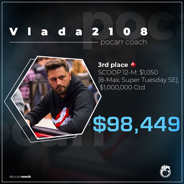 Поздравляем тренера Покарр Vlada2108 с 3-им местом и $98,449 призовых в SCOOP 12-M: $1,050 NLHE [8-Max, Super Tuesday SE] на PokerStars! Великолепный результат!!!