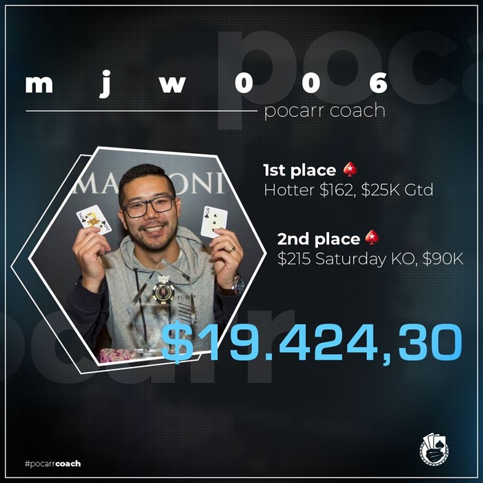 Поздравляем тренера Покарр mjw006 🏆 с заносом Hotter $162, $25K Gtd и 2-ым местом в $215 Saturday KO, $90K Gtd. Оба турнира сыграны на PokerStars. Отличные результаты! 👏