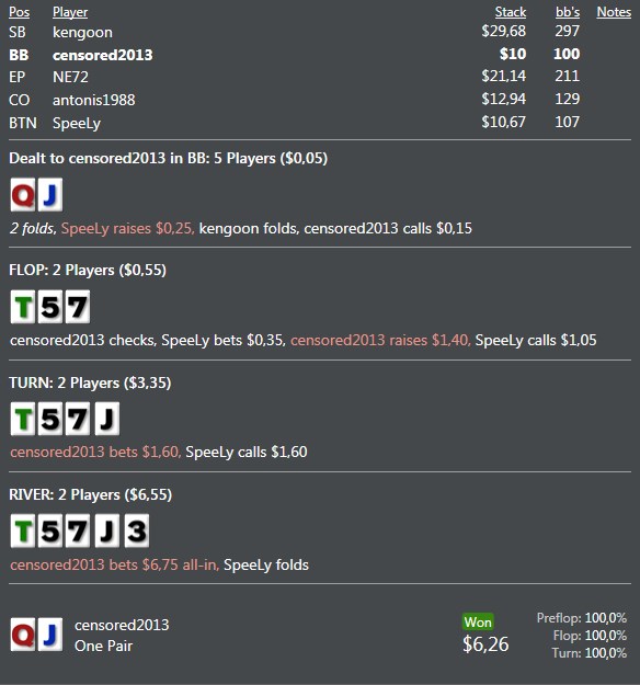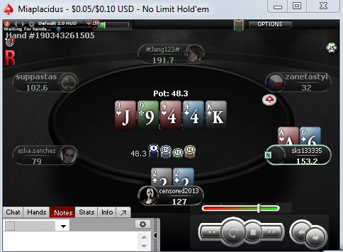 censored2013, Если учесть что ты так сыграл против меня , то годится , у тебя показатели агры очень сильно завышены , я знал что ты блефуешь но не хватило яиц вколоть без флеш Карты , у меня 89 были )) Но в целом розыгрыш ужасный и на дистанции минусовый , единственное что респект раз уж залез в эту жопу то пошёл до самого конца , но мне интересно какие руки ты клал мне в диапозон кола рейза и кола терна ? Интересна логика ) Или это были похуй беты ?)