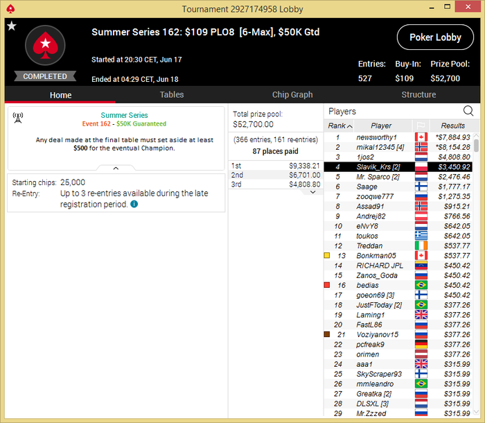 Короче, сегодняшний турнир не готов сыграть хорошо, поэтому не буду и начинать. Завтрашнюю турбину с гарантией 50к (которая изначально была не турбиной с гарантией 100к) наверное тоже отменю. Пока ещё надеюсь, что кто-то там в Парти поймёт нелепость таких сателит...
