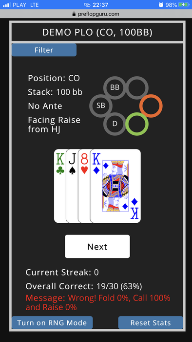 У гуру есть бесплатный пробник по ПЛО. Позиция только СО, 100бб. Потыкал и в некоторых местах был удивлён до того, что вместо "пойти спать" начал солвер грузить и проверять у кого косяк: 1. Как видно из моих 110 миллиардов симуляций, все 2-х мастные АКТ5 идут в 3-бет