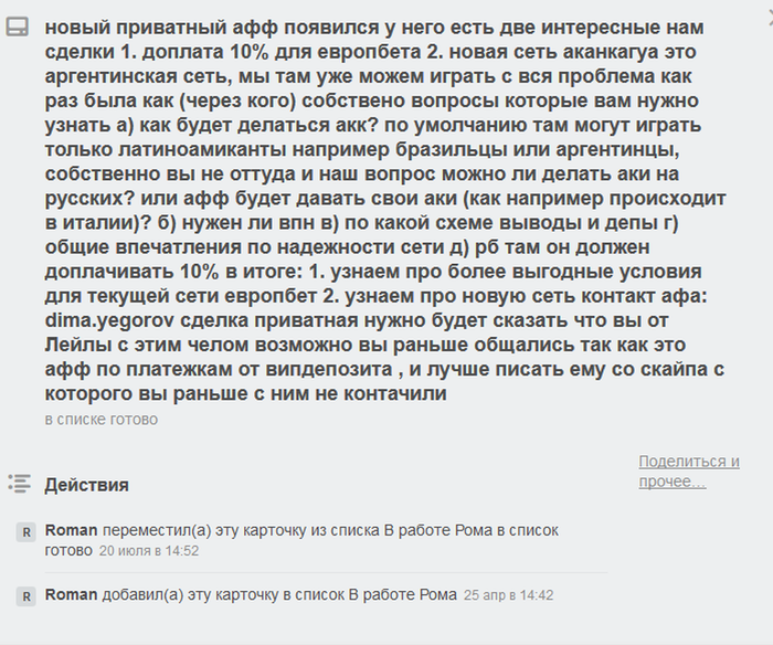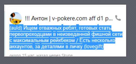 3. Самый большой текст с моим участием. Какие можно отсюда сделать выводы? Появился новый приватный афф, т.е. я, т.е. человек который вроде бы имеет выходы в какие то хорошие сделки. Дальше куча вопросов , которые задаются любому аффу. Самое интересное в конце: ".. лучше писать ему со скайпа , с которого вы с ним раньше не контачили..". Т.е. этот самый афф не должен ничего знать! Тем более он очень большой платежный афф и всех знает. Странная конспирация, если предположить, что я в курсе всего и помогаю ботоводам.