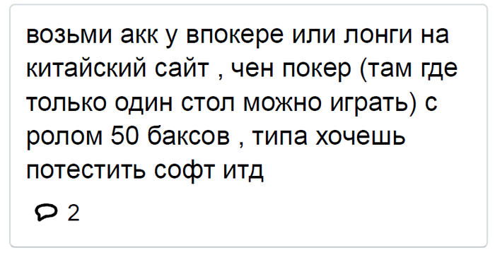 Belysh @ 31.7.2017 Я мало того что не ботовод , я вообще не понимаю что происходит, почему люди которые нарушают правила покеррумом пишут об этом в открытую и к ним нет ни каких санкций? Мне как фишу без разницы кто и что совершил , но если вы нарушаете правила покеррума где я играю или собираюсь играть вы все для меня мошенники , а ваши разговоры о не соизмеримости наказания оставьте себе . Согласен боты - большое зло онлайн покера , но и всякие неразрешенные попытки обойти запреты не далеко ушли .