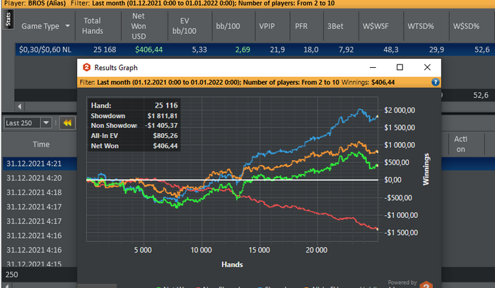 Декабрь получился не самый продуктивный вцелом, как мне кажется. Хотя это с какой стороны посмотреть. На весь мой ушедший 21-й год можно взглянуть не только с точки зрения игрока. Но и с точки зрения менеджера. Принятие ключевых решений в стрессовых ситуациях. Разбор раздач, конспектирование, знакомство с бэкингом, планирование графика, выкатанные дистанции. В середине марта у меня началась плюсовая катка на РРР. Вернее возобновилась. Каким то чудом мне уже тогда казалось. Сейчас мне кажется что тогда на плохую игру наложилась диспа. Ну так по ощущениям. Но в марте, мне чудом удалось "переключить рубильник". Внедрение новой страты в один из спотов. Плюс познание дзена по каждому лимиту. И подъём с нл10 до нл40 за 1,5 мес. И здесь во многом зарешали, как мне сейчас кажется, именно менеджерские качества. Далее шоты на лимиты выше - нл60-100 по МСС. На коротких столах хотел обрезать себе дерево решений на постфлопе - многое по игре рего-аккаунтов (RTA, как позже выяснилось) было мне не понятно. Самостоятельной работы в ресёрче у меня не было. И мне было интересно затестить это внедрение. Вроде на первые 10к рук в 6-макс регварах резы были хорошие. Но дальше потом ушли в ноль. Но это всё было на короткую дистанцию. Я не долго покатал МСС на РРР. К тому же при шоте лимитов нл60-100 я отдавал предпочтение 9-макс. Так как на них всегда и на всех лимитах результаты на РРР были ок. Короче, умение управлять собой как проектом/игроком очень важно для игроков, зарабатывающих и пытающихся начать зарабатывать. Опять же путь у всех свой. У меня, у старпёрского поколения, сложилось так что я ходил по краю и моей задачей было не только не свалится вниз и всё закончить но подняться вверх. В условиях очень маленькой финансовой подушки, что в свою очередь, означало короткий дедлайн без шанса на ошибку.