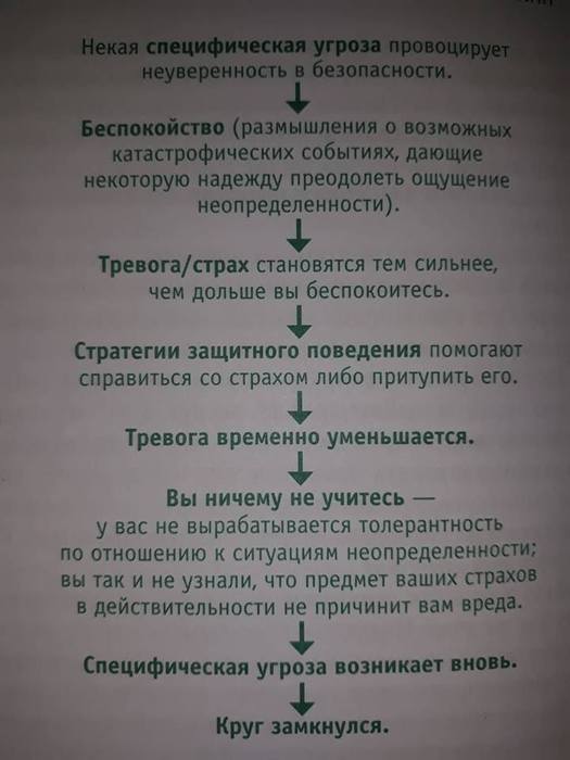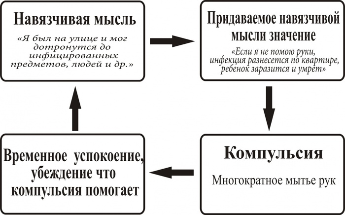 Причина ОКР: волнение и тревога относительно чего-либо, а выполнение ритуала всегда служит «актом успокоения», но к сожалению по факту исключительно усиливает обсессивные переживания и в конечном итоге приводит их к некоторому циклу. По мере нарастания обсессивно-компульсивного цикла тревога человека относительно причины действий исключительно нарастает. Говоря проще, пытаясь успокоиться человек на самом деле развивает в себе поведение в соответствии с которым он всегда начинает волноваться. Такая себе тревожная черная дыра.