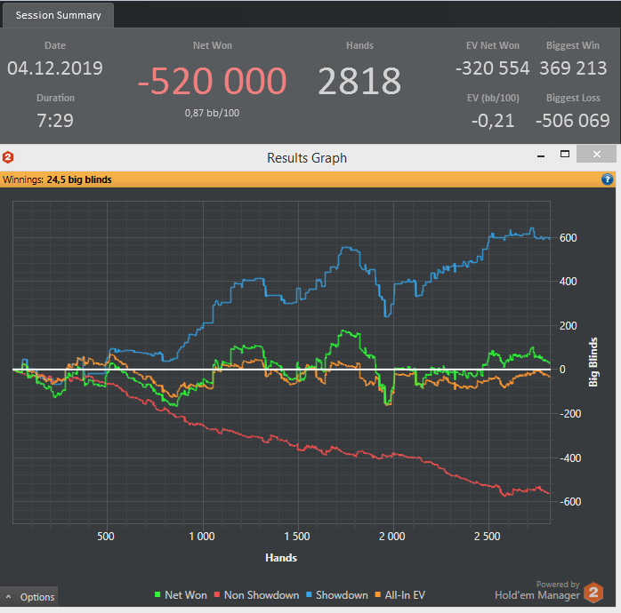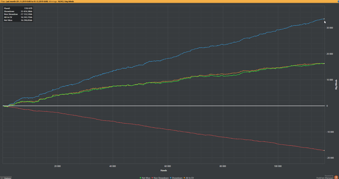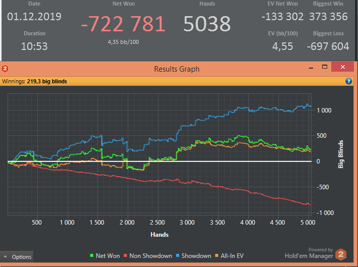 График по бб обычный прямолинейный конечно вроде все ровно ) А если посмотреть по фишкам) По сути дипраны там все видно что не складывались постоянно и увеличивалась разница ев и net won c каждым днем) но в конце месяца нам почти все вернули) Наверное оставили остальное на декабрь)