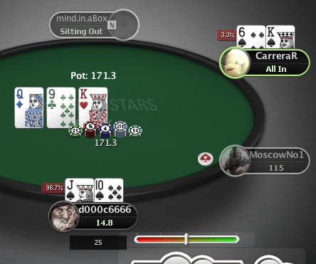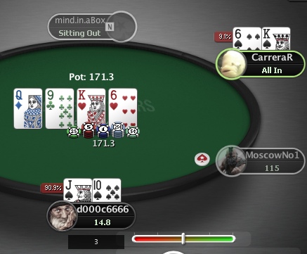 Mitch92, бля..... У меня такая же херня была в мтт когда до финалки 2 человека было. В итоге вылетел 11м. В общем мне прилетел флеш с флопа, я дал алын а опп по топ паре заколировал(( терном и ривером ему фул приехал!! Сказать что я охуел такого это ничего не сказать........