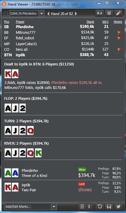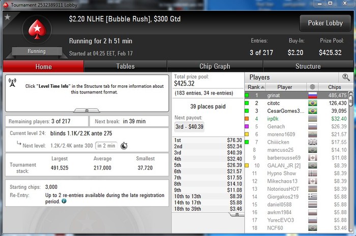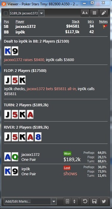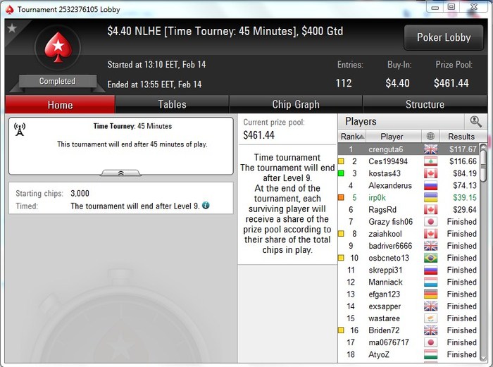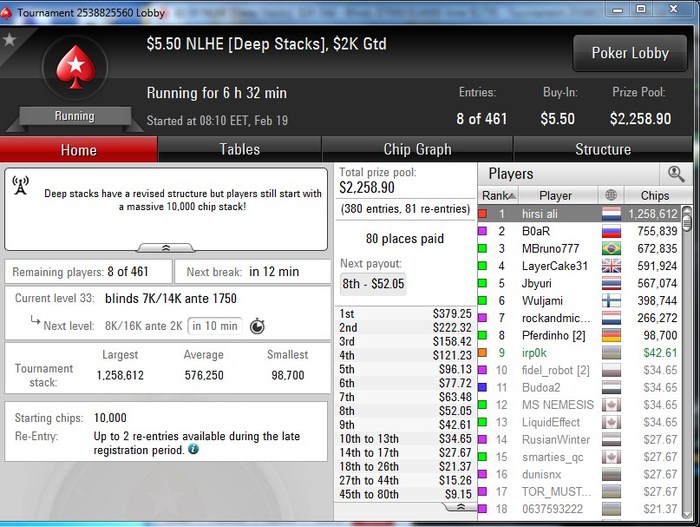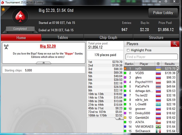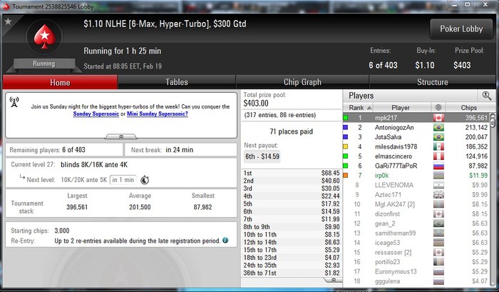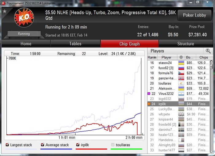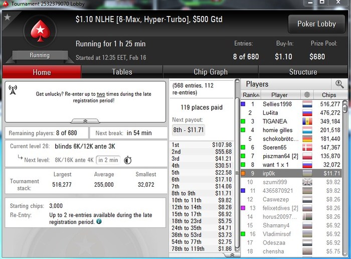 Cыграно турниров 20(сегодня уже не играл тайм турниров) Профит +9 В начале сессии улетел не очень красиво с троих по 5,50 ВВ, дипстек, гиперПКО ничего не получив с них, так сказать настроение на день получено. Гипер 3,30ИТМ, иду чипаком, теряю пол стека АА<JTи в конце QQ<AK эх старзыстарзы.....