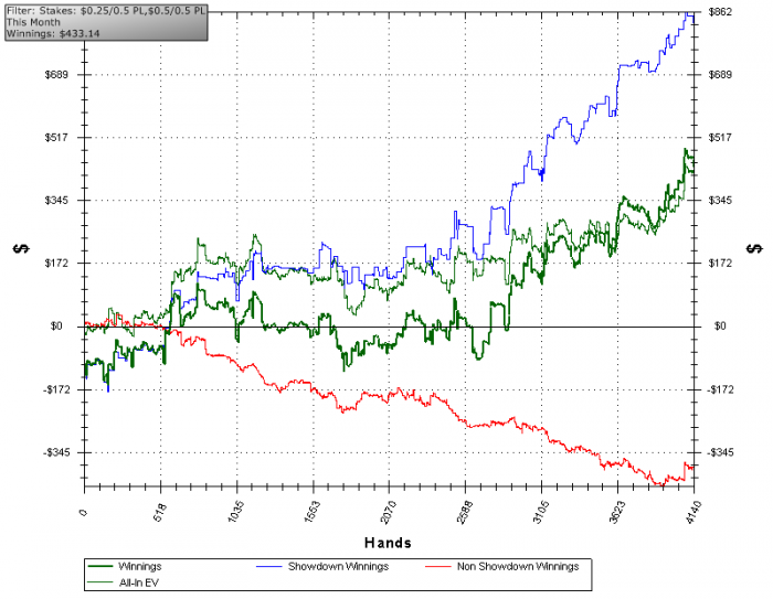 2. игра в 4 стола не позволяет мне в полной мере анализировать процесс (лазить на Propokertools, читать статьи на Бетфлоп, смотреть раздачи в реплеере по ходу игры). А делать это после сессии мне не позволит лень. Не надо говорить, что с нею надо бороться. Если ты работаешь 2 часа, а остальное время ленишься, то Надо. А если катаешь 6 часов, 5 сессий, перерывы между ними, какие-то домашние дела и т. д. То нереально сложно заставить себя заниматься еще 3 часа в день покером (а еще попробовать найти ту самую руку KsJd7c7h в базе и проанализировать ее).