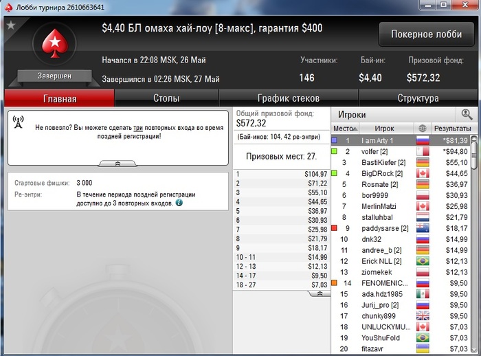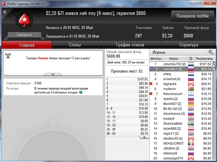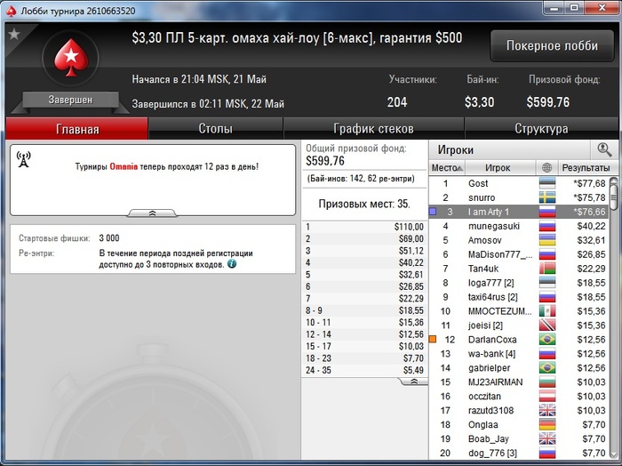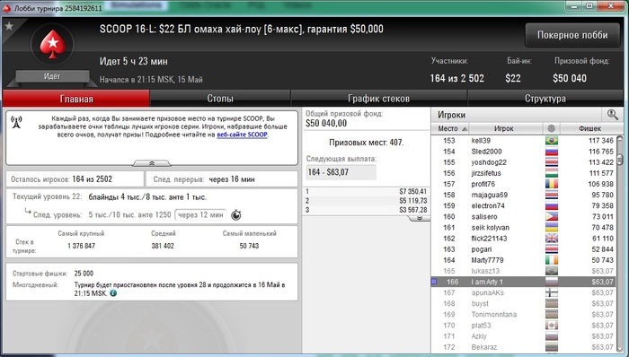 День в +33$ Не особо сложилось в турнирах, но зато удалось попасть в итм скупа за 22$, на который я отобрался вложив в сателлиты 6$, причем выиграл целых два, помимо входа в турнир получил еще 22 Т$ Составы кстати в сатах хорошие, люди правил вообще не знают, меня коллировали по одной карте на флеш ))) Завтра скуп по фикс лимит омахе хай лоу, будем вспоминать что там и как, не играл в нее лет 5.