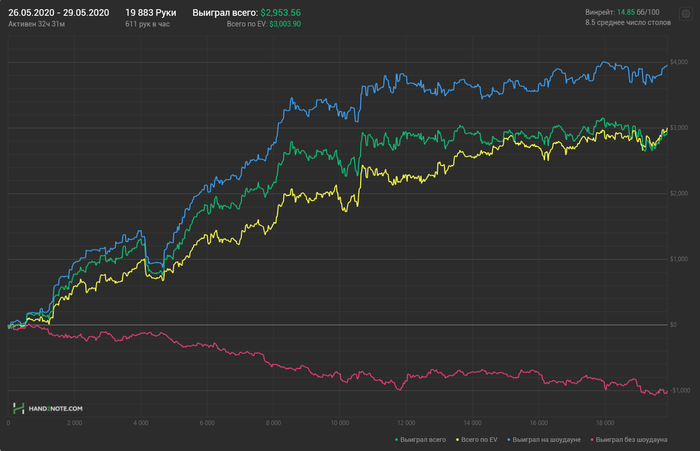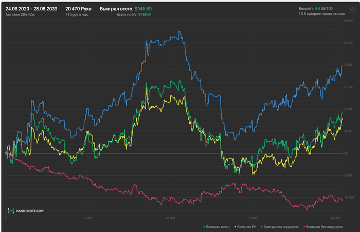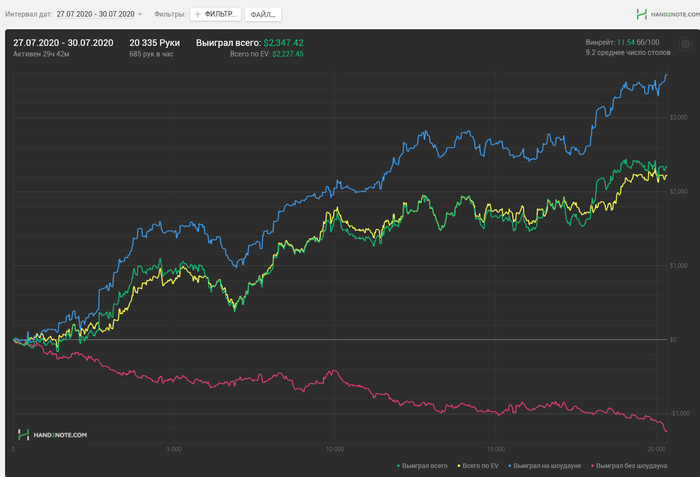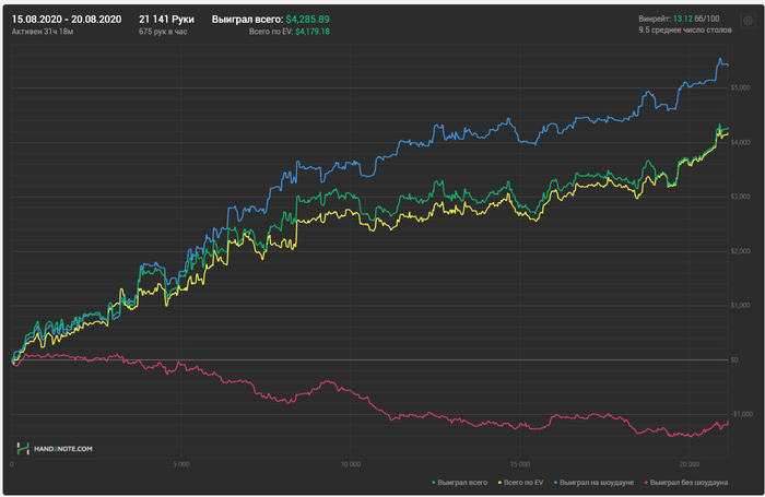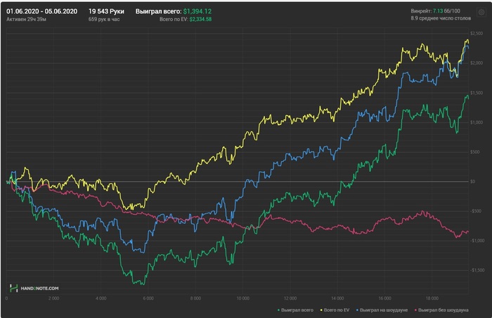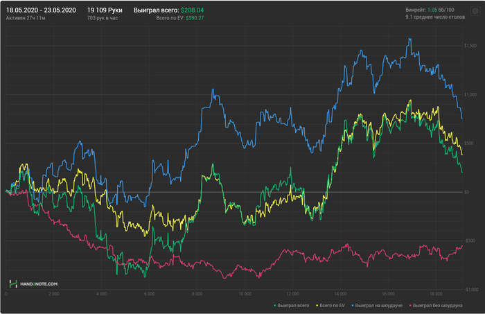 По кассе неделя вышла +500. Там одумались и опять апстричную включили. Не зря директор гсч покеркинга читает мой блог, испугался, что я раскусил их подкрутку после кешаута.