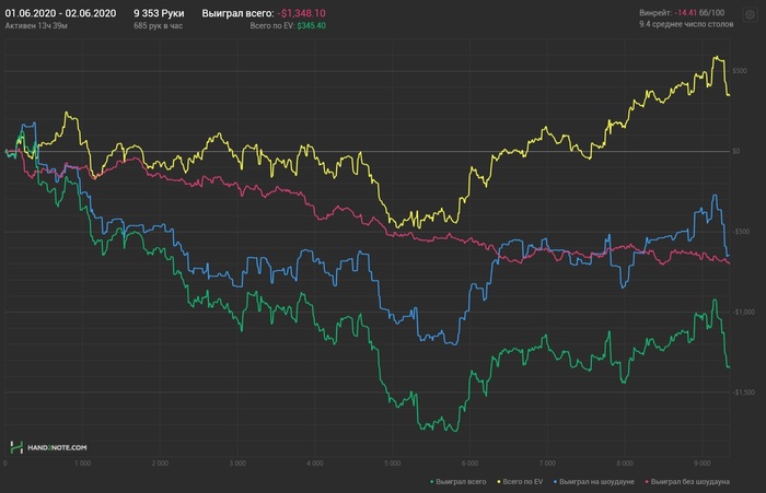По кассе, потому что трекер рисует более красивую картину, которая не соответствует действительности из-за исламских потов которые трекер не учитывает. А исламские они, потому что пиханина там явно не православная, да и название у них bomb pot:ph34r: Для тех кто не в курсе - 4 раза в час за столом с бомбами, все скидываются по 2бб (за фр столом) или по 4бб (за шх столом) и открывается сразу флоп. Баттон рандомному достаётся. Короче я в этих потах 9 стеков оставил Складывалось не особо, ну и пока только начинаю понимать что вообще делать против 8 игроков со 100% спектрами. Такое себе, вроде и весело, а вроде почему бы не сделать всё тоже самое с префлопа, а не с флопа.