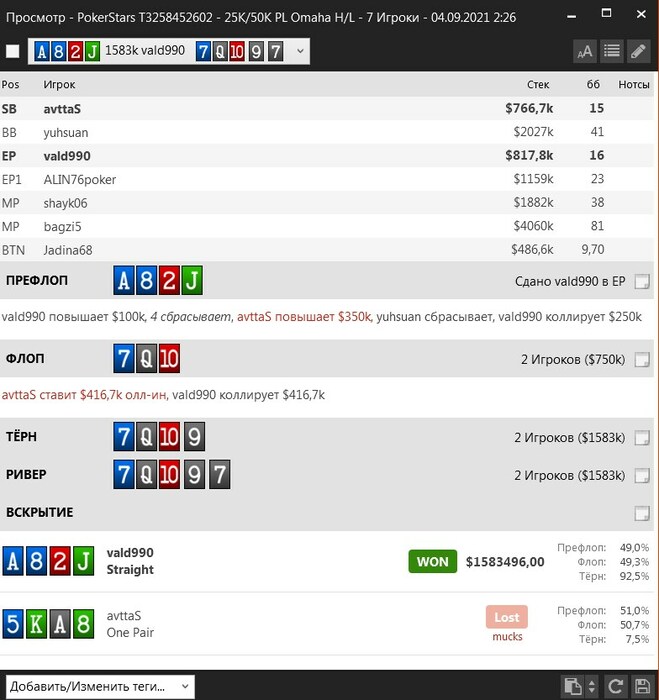 vald990 @ 06.09.21Раз уж такое бурное обсуждение пошло, скинул раздачу с открытыми картами. Добавлю, что не совсем верно, на мой взгляд, оценивать общий ФЭ в 36% без учёта позиции. Ну если б у оппа со всех позиций был одинаковый оупен, тогда бы это работало. Но если с УТГ узкий диап - уже надо смотреть выборку по фолду на 3бет по позициям, в ХМ3 есть такая опция. При достаточно большой выборке на оппа это помогает точнее оценить ФЭ. Не знаю, как у других игроков, но у меня из ранней явно значительно меньше 36% будет