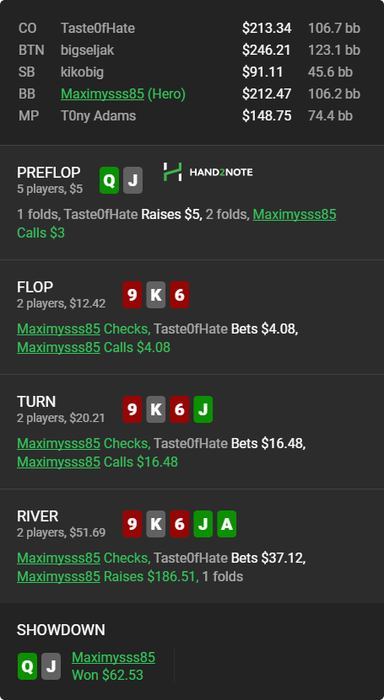Во время игры эта рука показалась лучшим блефом в плане блокеров, однако позже проанализировав раздачу я выяснил что это далеко не лучшая линия, я тут должен пушить только QT которые я слоуплеил на терне (которых будет не много) и в качестве блефа лучшей и единственной рукой тут будет TT (все комбы что сюда добрались), по тёрну колл с ними пограничный и частично делается именно ради таких вот мувов. Лучшими блаф катчерами у оппонента будут QQ\AQ\AT при этом почти все сеты и доперы он должен выбрасывать