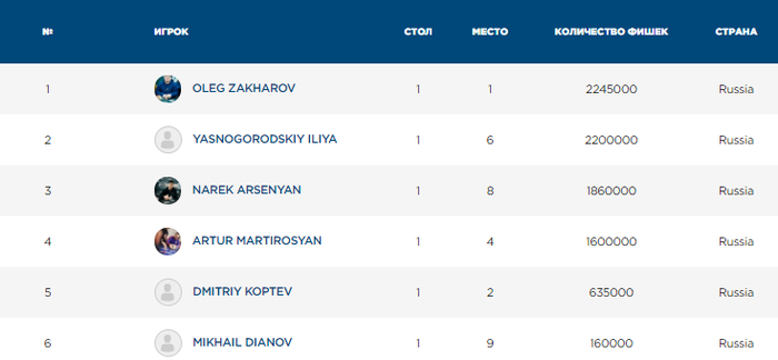 Финальный стол: Олег Захаров Дмитрий Коптев Константин Генералов Артур Мартиросян Роман Леско Илья Ясногородский Анатолий Зырин Нарек Арсенян Михаил Дианов
