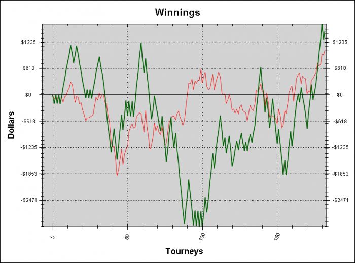 Просто допустим пример,я играю матч,у меня 450 фишек у оппа 550,мы выставляемся у меня АК у него к примеру QK.После этого АИ,стеки стали:у меня 900,у оппа 100...мы выставляемся,у меня допустим 69s у него АQ,я тащу этот АИ с низу...И получается на графике в ХМ линия ЕВ покажет то что я проиграл этот матч???Хотя основной АИ был выигран справедливо.А это уже выставление по сейджу,учитывая блины 15-30.