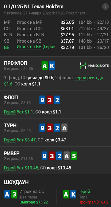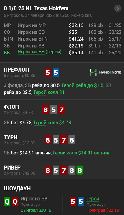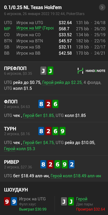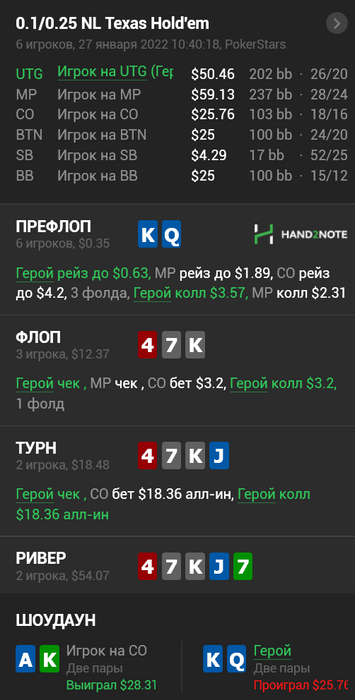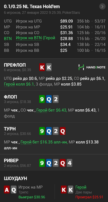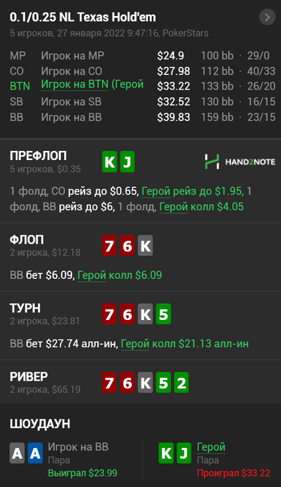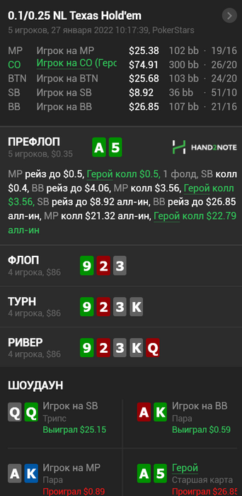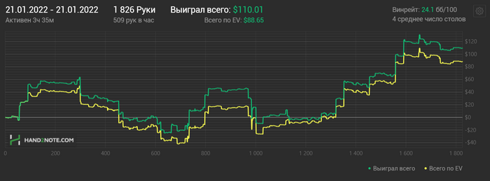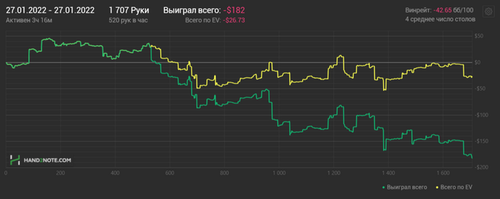 ZhenaBomzha @ 27.01.22После этой раздачи, я просто как не адекват стал заливать одну раздачу за другой. Хотя уже отвались на терне, ну или максимум на ривере, я бы себе сказал, что я красавчик и что не проиграл больше денег, чем следовало бы.