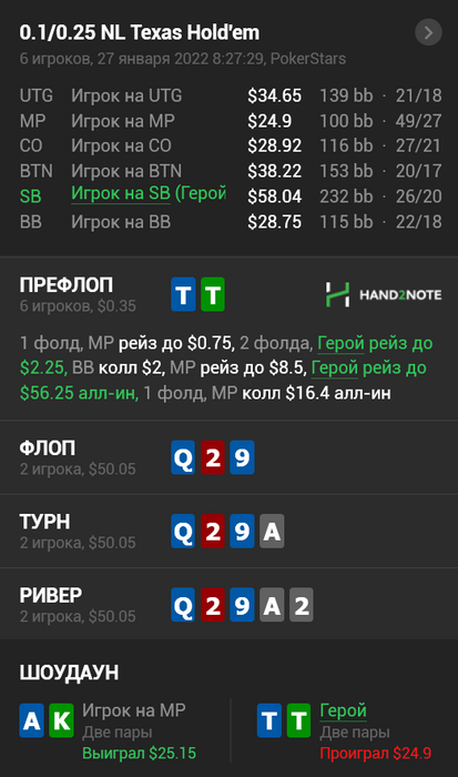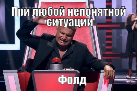 На терне после чек-рейза от адеквата, первая мысль, что пришла в голову "жми фолд". Там в большинстве случаев, если не всегда будут сеты, ну или как вариант QQ+. Но естественно, я же "долбоклюй", подумал, ну подколю пятачок, я тем более в позиции, если куплю своего вальта, то стекану его. А если нет, то из-за позиции можно будет сыграть чек-бихайнд, ну или же отвалиться. При спаренной двойке, на его пуш, я уже забыл про весь диапазон, который я ему уже накинул на терне, которому я всему проигрываю. Тут я начал уже думать, а мало ли у него допер оказался по типу 89s, который я уже бью, а вдруг там натсовое фд, которое не закрылось и теперь он его доблефовывает. И с лицом полного кретина нажал колл.