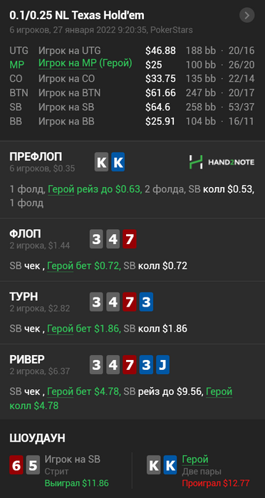 5) Опять же куда ты лезешь с таким кикером на ривере, сыграй чек бихайнд, ну или же небольшую. На пуш сдайся, так как рук хуже тут точно не будет.