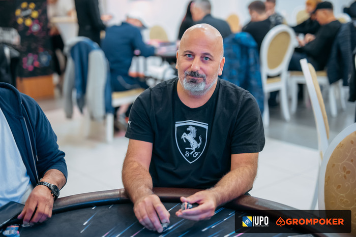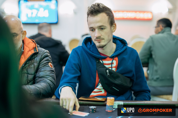 Сначала раздача, в которой Павел Белоножно лихо покатался на качелях, выставившись префлоп против Андрея Коджакари, в стеке у которого оставалось всего 60,000.