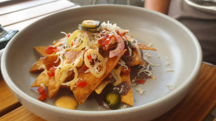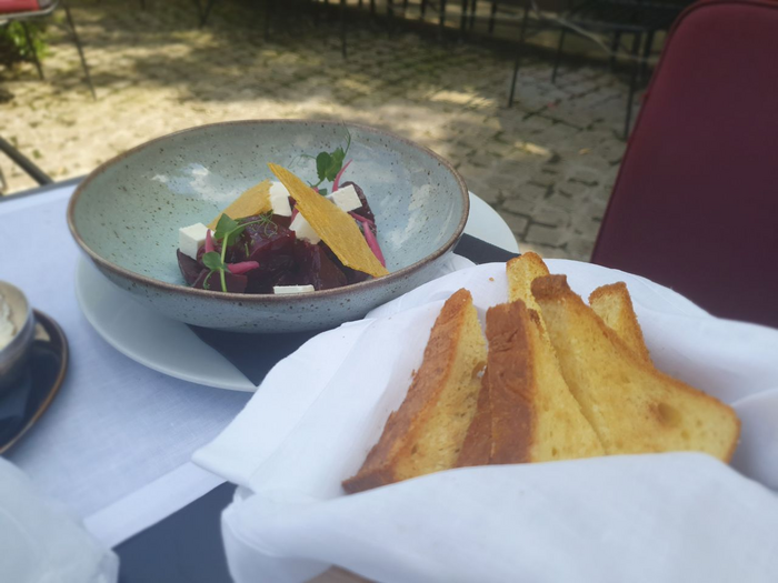 Зашли также ради эксперимента в два случайных места. Латинский гастробар "Taro". Салат из начос, кукурузный суп(оч крутой), 100% сок из малины, грибы во фритюре. Оч приятное место на набережной с видом на Дунай и хорошей кухней.