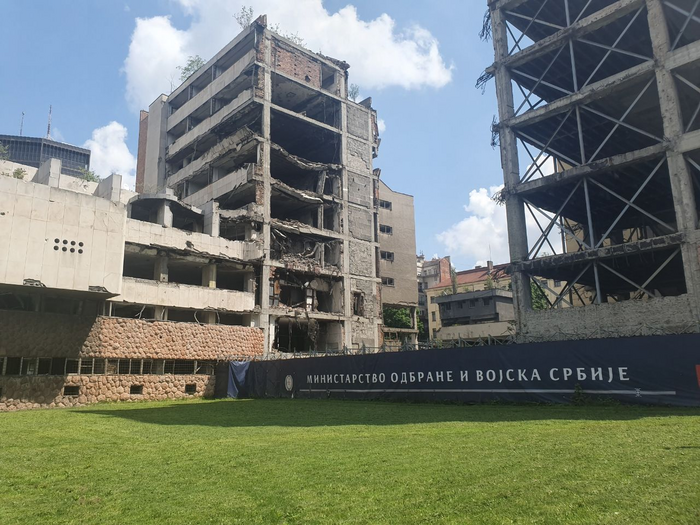 Здание пострадавшее от бомбардировок НАТО. Как я понял, оставили ради символичного характера, т.к. в целом в городе нет следов войны как например в Сараево где каждая вторая стена в следах от патронов