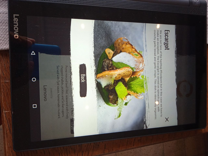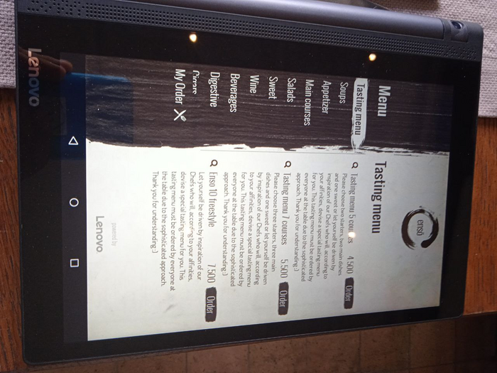 Меню принесли на планшете. Я вообще сторонник традиционного бумажного меню, но признаю что тут это было прикольно реализовано с возможностью заказа прямо с планшета и красивыми фото. Кроме того, видел экземпляры бумажного меню лежащего на входе.