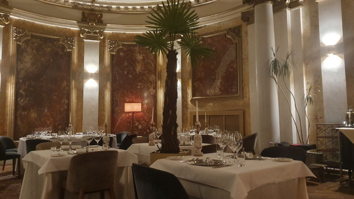 Салон 1905 - такое классическое пафосное в хорошем смысле этого слова заведение. С безупречным обслуживанием, скатертями, кухней ближе к классической, величественными интерьерами.