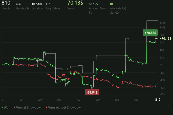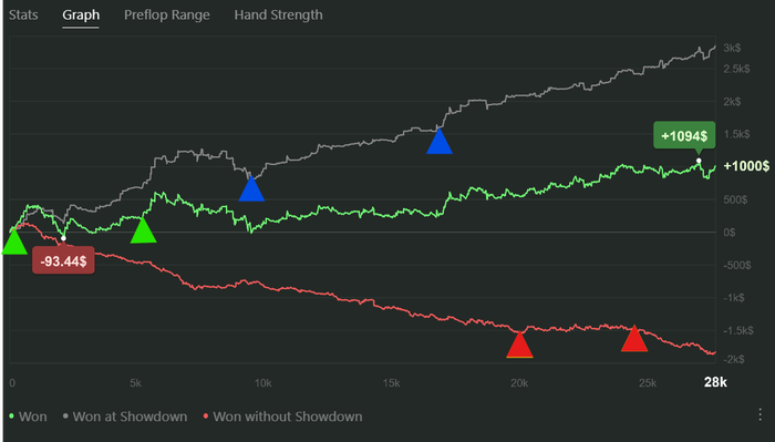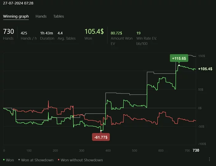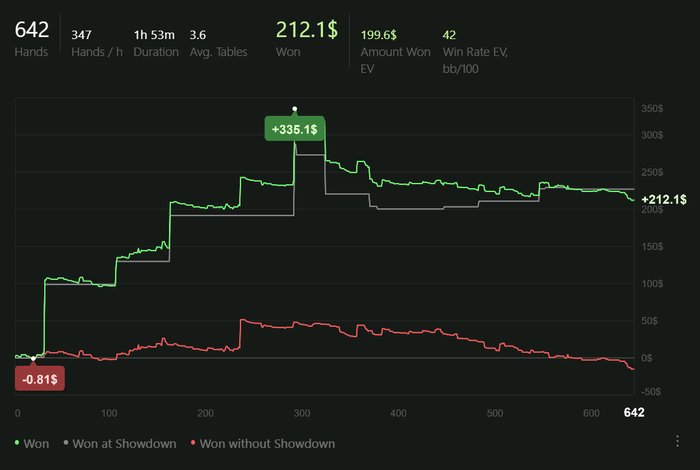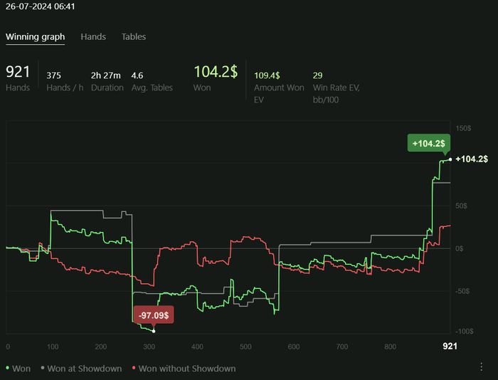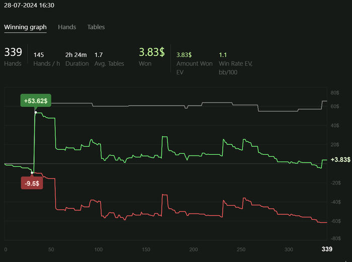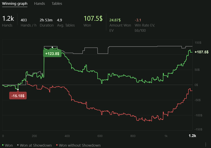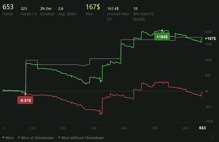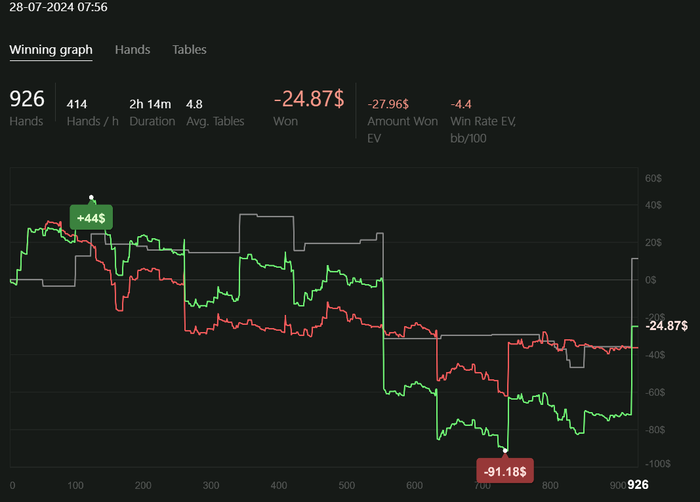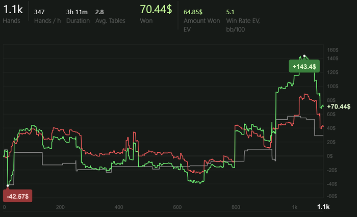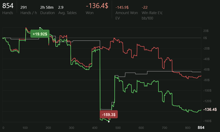 Играю качественно, но мало. Сессии от 2 до 4 часов в день. Анализирую оппонентов, дописываю нотсы. С каждым днём больше информации собираю, уже внедряются подстройки. Задача: держать красную линию в нуле.
