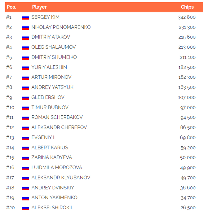 Не потащил Роман и этот олл-ин, вылетев на 22 месте. У Атакова теперь 455,000 фишек. Чуть позже вылетел еще один шортстек - Владислав Клепиков.