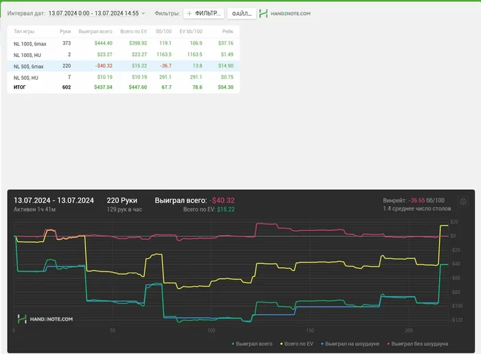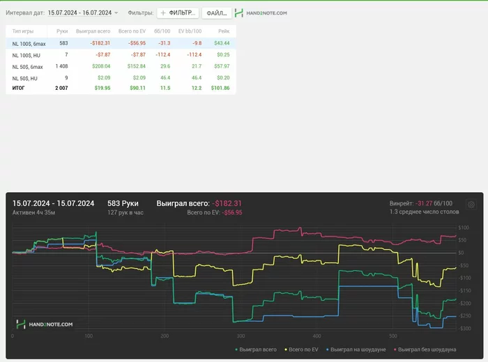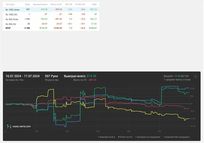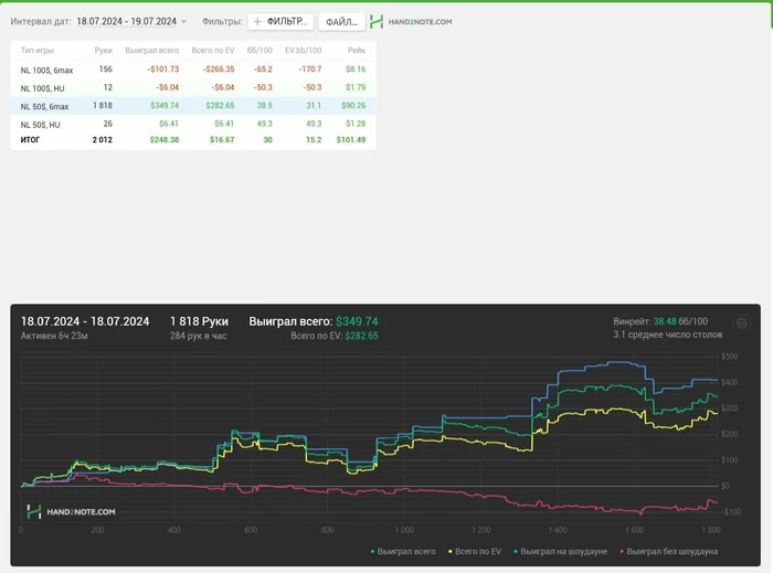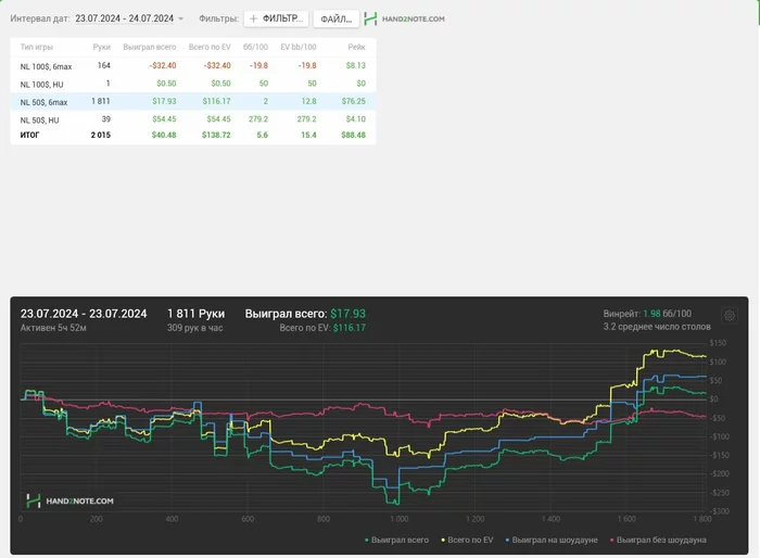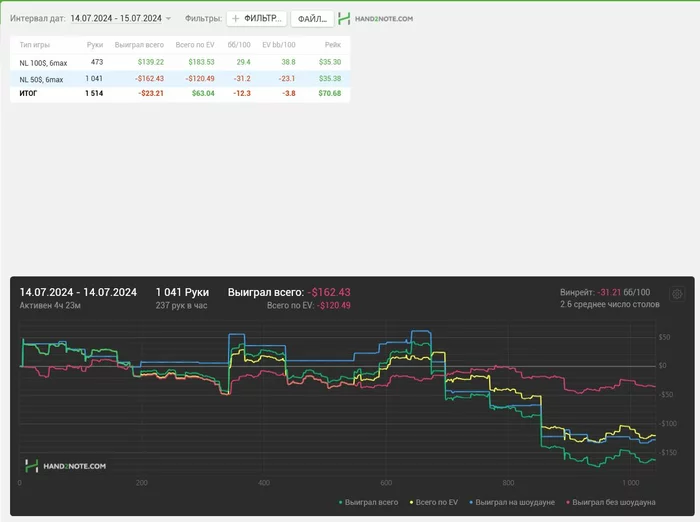 Я вчера после сессии был выжат, как лимон, поэтому отложил до сегодняшнего дня написание данного поста. Что касаемо сессии? Я их разбиваю на 2-е по 1к рук, тогда и концентрация хорошая сохраняется и я не плыву. Первая часть была отличной, все получалось, все что хочется - оплачивали, а вот потом начался трешняк) Вечером проиграл просто все, в борд не попадал и пытался собрать хоть какие-то крохи, но не вышло)) Итого: началась это слабозаливная борда)) Но вр все равно хороший, поэтому судить рано)