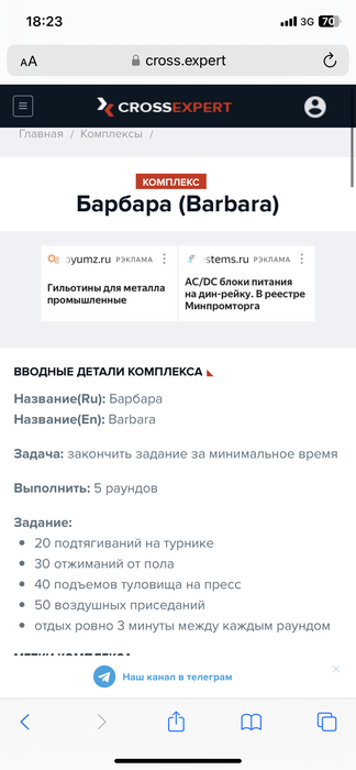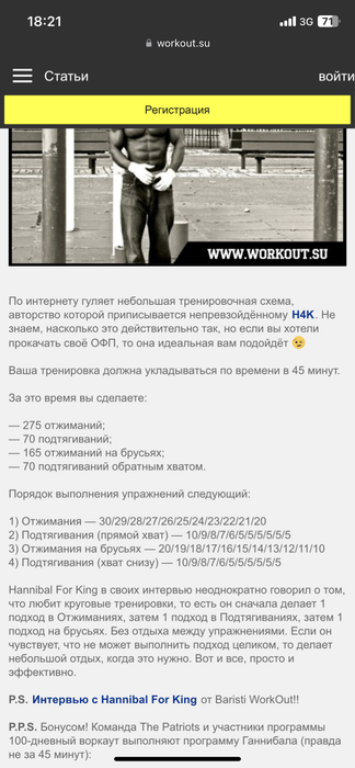 Днем делал комплекс "Ганнибал" (смотрите на скрине выше). Пока, это самый тяжелый комплекс для меня, в конце руки почти не гибаются. Брусья делаю по 3х3 раза, чтобы хотя бы закончить его)