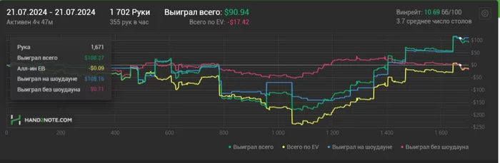Вчера камбечил по классическому сценарию, а сегодня захотелось покатать 100-ку под ВИПа, столы были хорошие. Планировал откатать 1к рук. Зашел, всосал 3 стека и пошел отдыхать. Я должен был продолжить, если смею называть себя про, но меня уже так заебало это все есть, что я ментально не готов был на еще один камбек. Целесообразнее было закрыть столы и пойти отдыхать. Лучше пойду перезагружусь, уберусь в квартире, отдохну и завтра ворвусь в бой. На этом повествование закончено)) До завтра) Не хочу ничего писать, настроение поганое до ужаса, если честно)