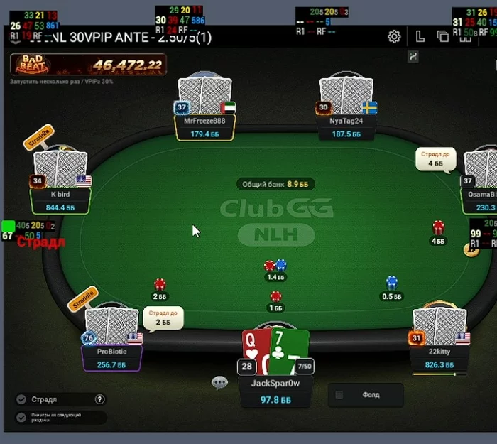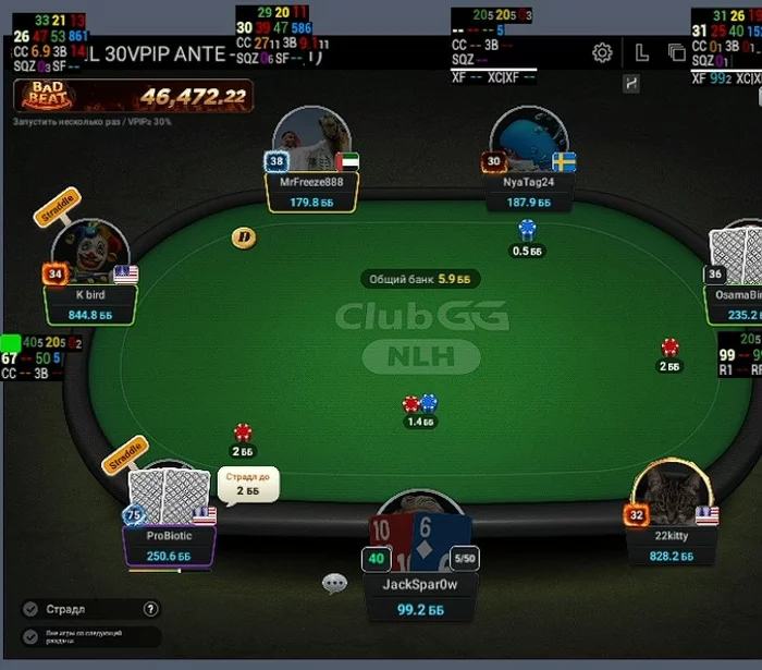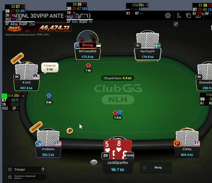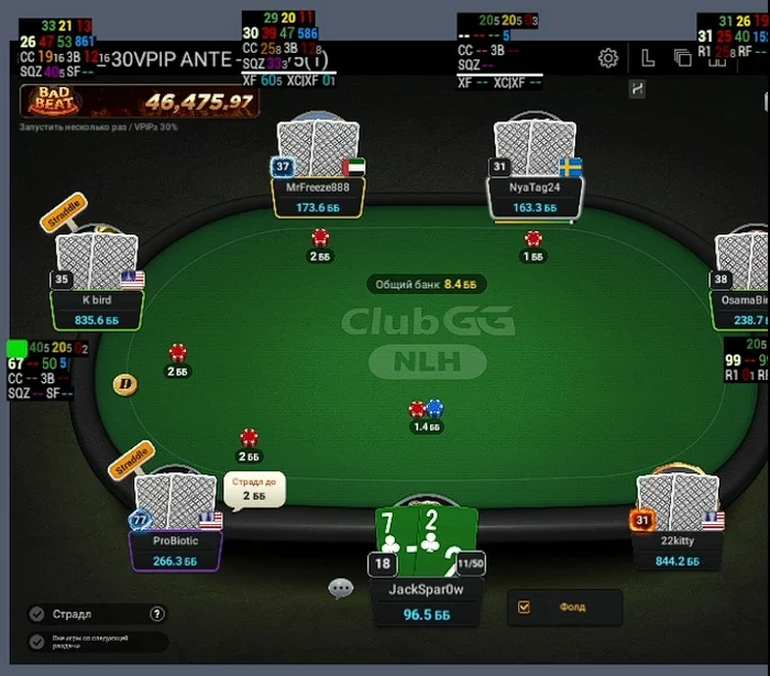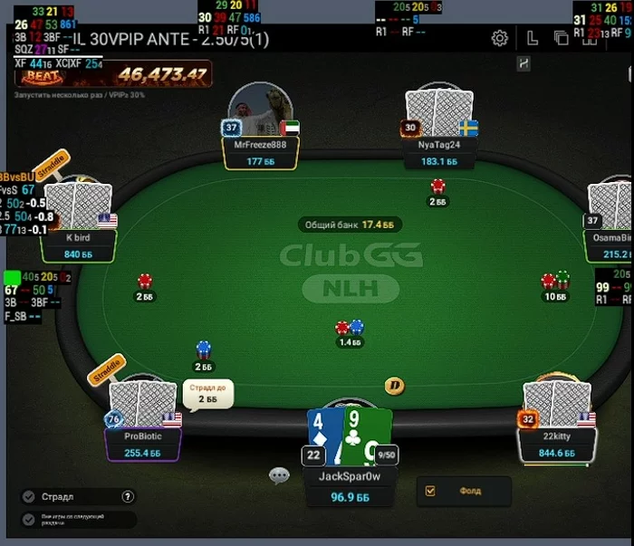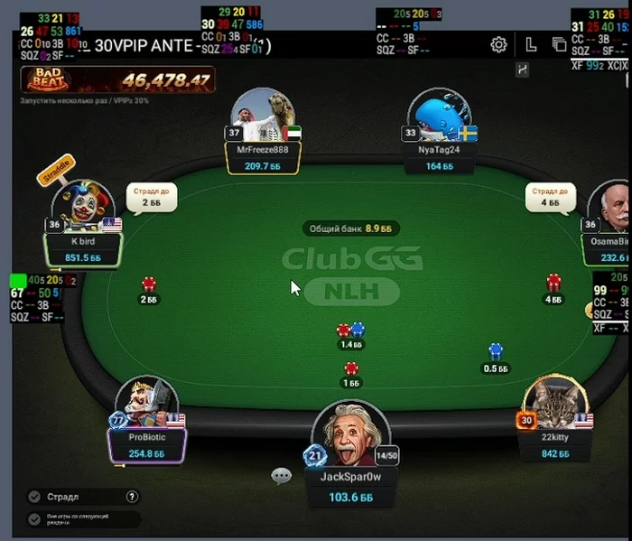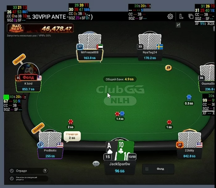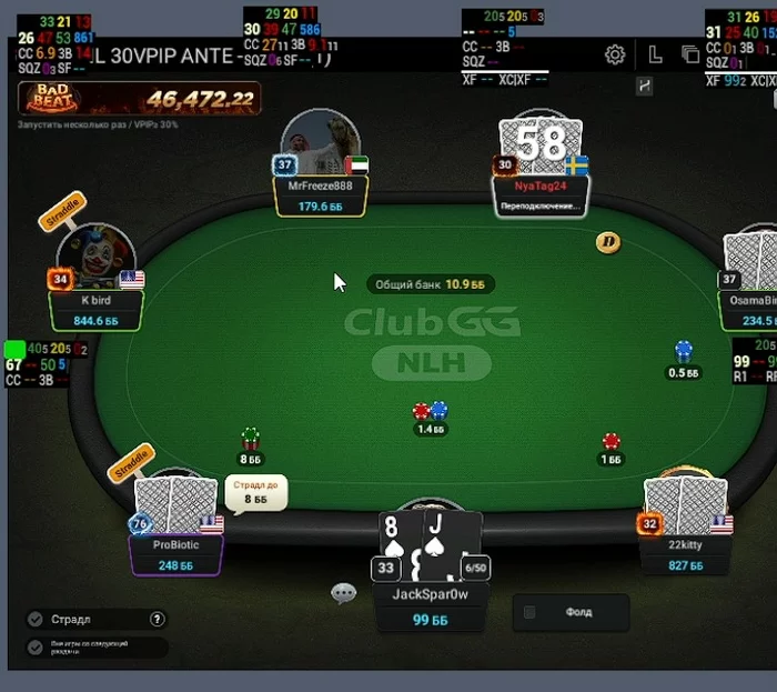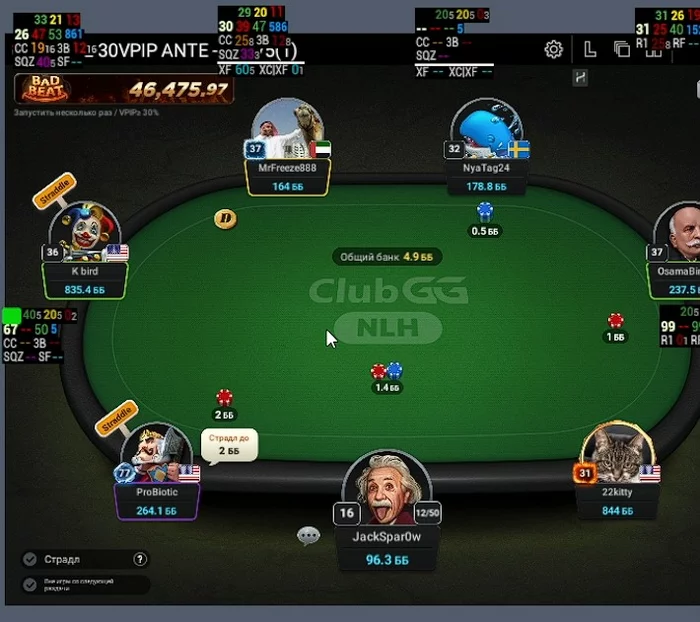 ProBiotic - Впип близкий к 100, за 30 мин игры при мне не разу не нажал кнопку фолд.