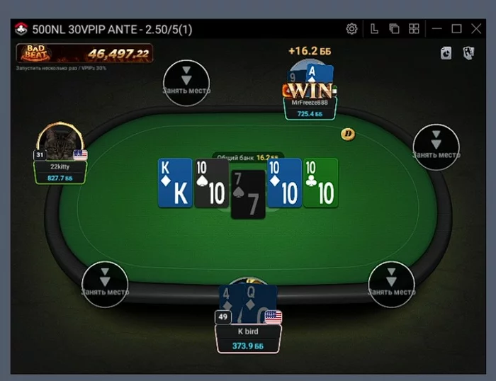 Видели когда нибудь випача, бамхантящего игрока со впипом 31? Теперь видели! 22kitty через секунду ливает и пересаживается на левый стол. Ему не нравится именно Probiotic. То что все 3-е в сговоре он скорее всего не знает.