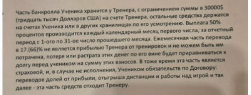 Чтобы если ученик отыграл за какой-то месяц не 40к рук, а 39999, или его работа над игрой не понравилась, весь банкролл достался тренеру (до 30k$, не ну а шо?🤣🤣🤣 тренер хранит у себя чужие деньги, равные его ожиданию от катки за год-два, вполне безопасно 🤣)