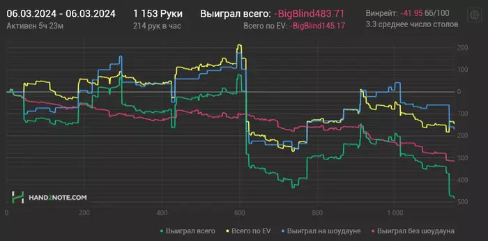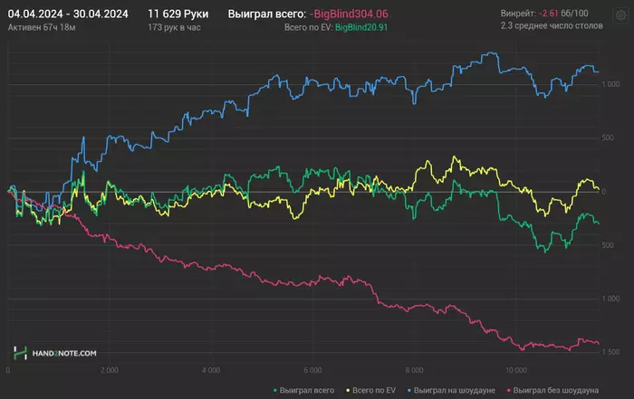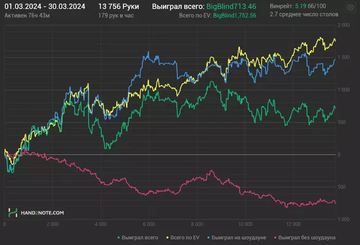 Вероятно это мог быть бест манс, если бы я не словил такой недобор. Но кому какое дело как это могло быть. 2 месяца игры в 0, и на третий месяц в фонде когда эта мясорубка вроде как закончилась я просто отпенетрировал этих ребят в 13евбб/100. Дорогая, сегодня на ужин "Евэшка" сделай по маминому рецепту, он мне очень понравился. Может показаться что это достойный результат, но именно в марте в приложениях произошла чистка целевой аудитории и я откатал все также "достойные" 13 с половиной тысяч рук за месяц💪 залипать в 1-2 стола в поисках игры - привычное дело. Садиться за компуктер и 30 минут мониторить лобби, чтобы наконец-то найти заветный столик - привычное дело. В общем не понос, так золотуха. В конце месяца попробовал перейти с вечер-ночь, на ночь-утро, откатал так неделю и в итоге словил бессонницу, пытаюсь обратно перейти на вечер-ночь, но забыл как делать так чтобы уснуть. Конечно надоело это все, хочется катать, хочется делать результат, хочется набивать дистанцию, последние 3 месяца не назвать классными и прогрессивными, но работа все же ведется и я не намерен останавливаться, теорией все так же стабильно ежедневно один-два часа занимаюсь (не забывая про выходные), в марте немного забуксовал, словил кашу в голове и пришлось сделать шаг назад, но в целом темы отрабатываются, материал закрепляется, движение вперед наблюдается.