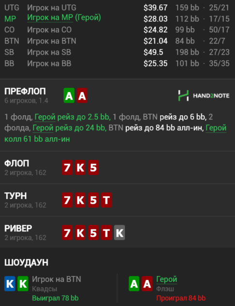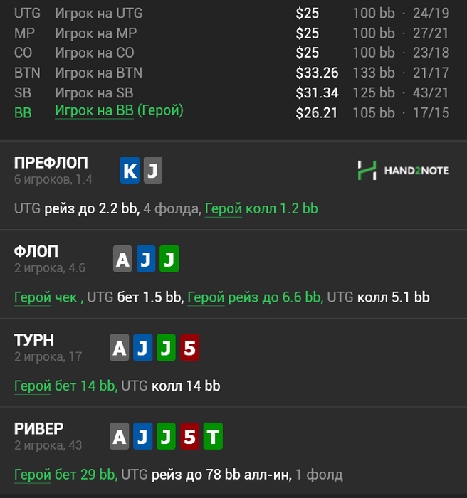 GeorgSLON, по раздаче с KJ: ривер если нас не будут блефкетчить по Ах (а я сомневаюсь, что на нл25 будут), то вбет не пролезает. И при таком раскладе можно подумать, что наша линия не оптимальна. Если мы хотим играть через ч\р играть, то я бы выбирал между мелким сайзом ч\р + блокбет терна+ ривер по ситуации, чтобы для его ТП не было изигейма или уже с терна переходить в чек + оставлять отложенные блефы в чек-чек линию на ривере, т.к. после ч\ч можно уже будет не стесняться и увеличивать сайзинги по риверу. А если опп на наш чек терн будет много блокбетиться, то можно терн еще раз ч\р играть.
