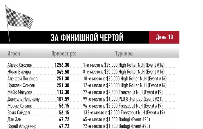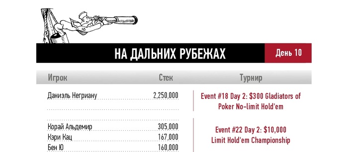 Алексей Поняков и Эрик Сайдел — первые потери второго дня хайроллера, а вот Артур Мартиросян удвоил нажитое вчера: у него уже больше 1,5 миллионов фишек. Из новоприбывших отметим Корая Альдемира и Фила Айви, а также неожиданное появление Бринна Кенни, обещавшего пропустить этот WSOP. Все они начнут с чуть менее чем 19бб.