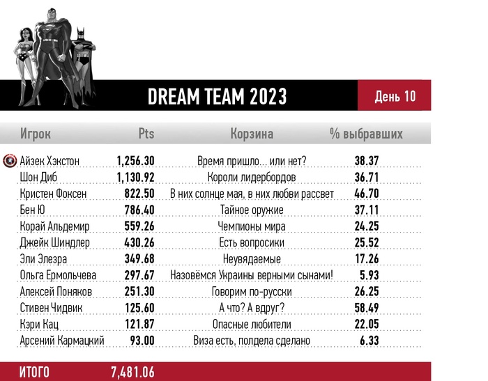 Обновленная Дрим Тим прибавила за день 1,113 очков, а лучшим капитаном внезапно стал представитель корзины "Время пришло... или нет?".