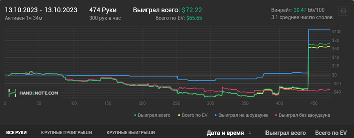 Эти сессии оказались самыми содержательными в этом месяце, накопилось немало интересных раздач. В первый день улетел на 6+ би, при чуть ли не положительном ЕВ. Не тильтанул, спокойно доиграл. За следующие 2 дня удалось выйти в небольшой плюс.