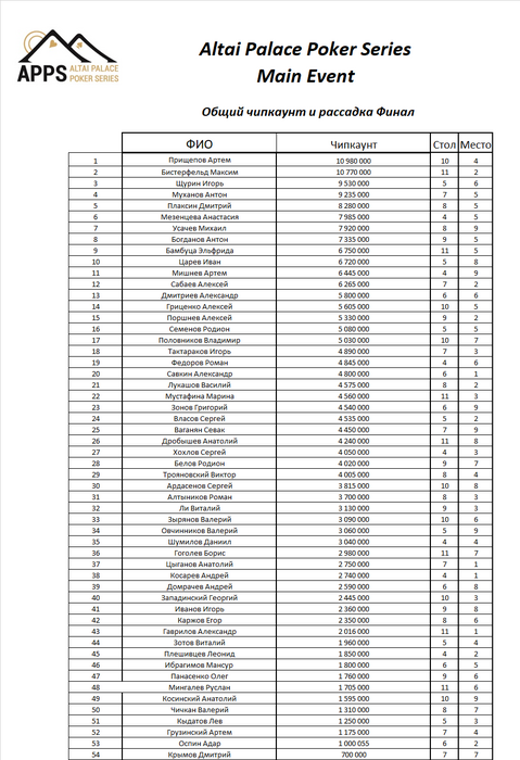 Финал Мain Еvent. Уровень: 21, блайнды 60.000/120.000/120.000, в игре 53/220.