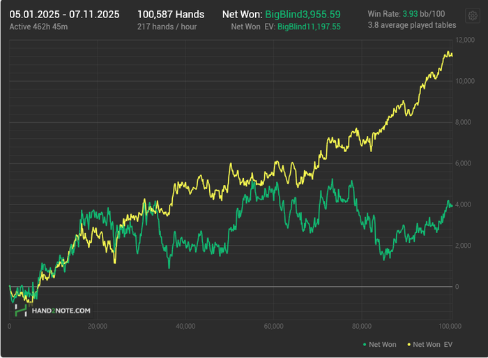 Все могло бы быть по другому если бы мне не резали лимиты и ставили стоплоссы в 3 тыщи за любой свинг на 1к. Как минимум я бы мог отыграть в 3-5 раз больше на своем лучшем лимите на котором у меня стабильно больше 10бб/100, а не пытаться отмазать мейк в 20-30к на пло200, который я и так катал потому что игры больше чем на 500 рук в день на нем не было. От себя картина примерно такая же за последние 2 года, но дистанция совсем маленькая. Единственным исключением был Чико, в котором у меня конфисковали все средства. Причем мультиакк был ок, пока я заливал, меня про него спрашивали и сказали что все в порядке, даже дали вывести на операцию. Но когда я начал выигрывать и хуже того, выгонять ботов с позиции на фиша при старте стола, сразу стало не ок. За прошлый год такая же ситуация, только больше недодачи в $ и отрицательный результат. Руки проебаны когда лег комп В 2023 было хуево и без покера. В 2022 ебали весь год , начиная с января в -50к, но по крайней мере мне не резали лимиты и жилы и я как то вышел в плюс. Последний хороший год был 2021, но 2020 я примерно каждый день начинал с минус 10-20к, нередко доходило до 50 при том что банкролл болтался между 200 и 300 весь год. В один день я отмазал больше 100к, но после этого я понял что больше не готов к такому, собственно так я и пришел в фонд