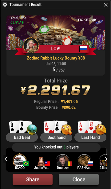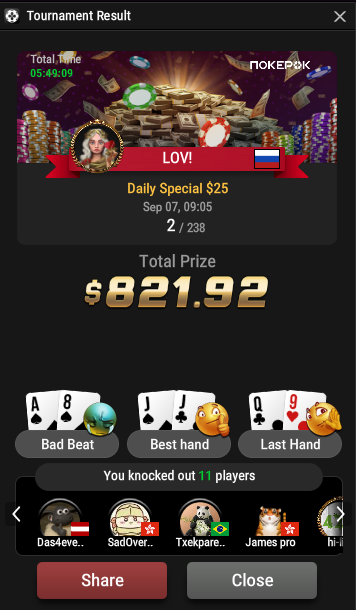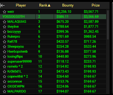 В общем перешел на катку преимущественно по выходным, но сегодня висел билет в день 2 в дешевом 7евро мистери. Режим, конечно, у меня шляпный: постоянно встаю и ложусь в разное время суток. Сегодня почти проспал этот турик, проснулся, а он уже идет минут 7. Даже были мысли типа: да пофиг, уже норм лутанул в этом месяце, дешевый би, можно поспать с кайфом. Но кое как, мыслями о чашке кофе и роллах в холодильнике все же поднял себя и, кто бы мог подумать, вытащил топ3 баунти за ситаутера-автоолынера. В сумме почти +1k$. Приятно из такого мелкого, ничего не обещающего турнира вытаскивать неплохую сумму, ничего не скажешь