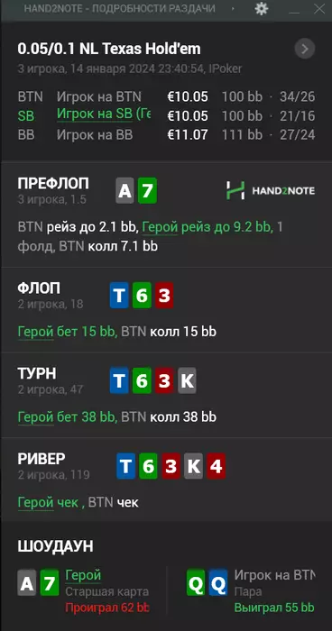 Друзья,спасибо за анализ. Очень было интересно почитать ваши мысли, практически со всеми вашими доводами я согласен. Разве что 3-бет с А7 по прежнему считаю плюсовым, так как опп который открывает более 50% рук с BU и имеет фолд на 3бет 60% становится эксплойтным практически с любыми моими двумя картами, тем более он там и постфлоп на кбет норм сбрасывает. Я посмотрел внимательней, конкретно на мой 3-бет у него фолд 80% на 5 сэмплов.