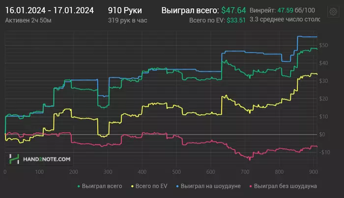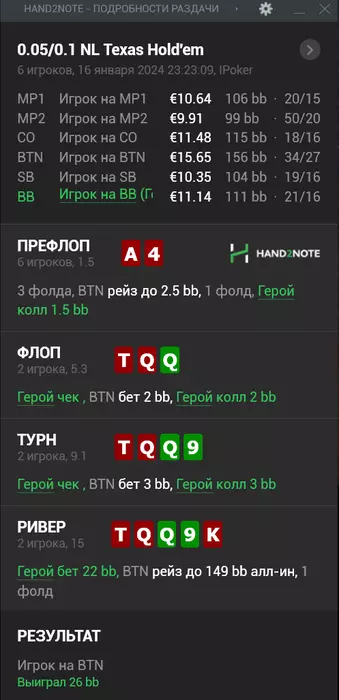 novoros, Да,мысли разумные. По поводу сайза флопа-он норм, тут я опечатался. А насчёт того, что он дал мне наловить дров мелким сайзом тёрна это разумно, только ведь я ему по фд и оесд тут и больше могу платить, и он это понимает. Судя по статистике паттерн его игры с запасом агрессивный, а такие оппы редко баррелят мелкими сайзами, такой уж психотип...это и смутило.Но в целом да,теперь уже думаю,что это тупо Q10.