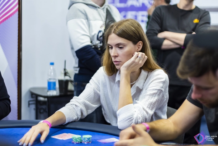 Мы переходим в стадию синхронных раздач. Последней игру покинула Елена Синявская. Столкнулась блайнд в блайнд с Артуром Белочкиным. Артур с смог вытащить против .