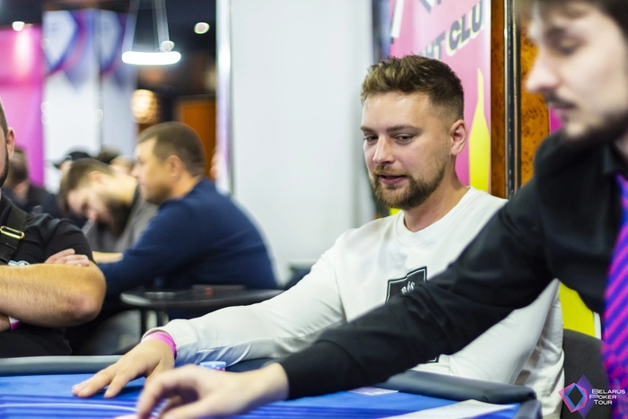На предбаббле вылетел Максим Рогов. Запушил 60к в открытие 55к Артура Белочкина. На большом блайнде Александр Калинкин уточнил, есть ли шаг у Артура и нажал колл. Белочкин тоже докинул фишек. На флопе одной ставкой Артур выбил Александра из раздачи.